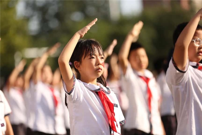 全国红领巾中队六(9)中队同学演绎情景剧《特殊的礼物》(指导教师:丁胜利),以跨越时空的对话致敬英烈;育新合唱团与五(9)中队共同献唱《如愿》(指导教师:王光月、王征),用歌声传递“这盛世如您所愿”的深情告慰。在大队委员及大队辅导员吴老师的带领下,全体少先队员庄严宣誓,铿锵呼号,许下“强国有我”的青春诺言。