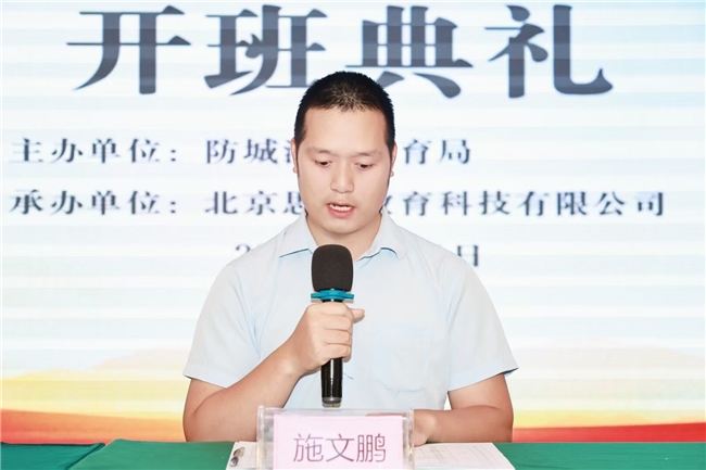 防城港市教育局电化教学站干部施文鹏在开班致辞中强调,当前,数字技术正以前所未有的速度重塑教育生态,在教育数字化转型背景下开展此次培训具有重大意义。施文鹏还对参训教师提出期望:第一,以高度的责任感和使命感全身心投入培训,认真学习先进教育理念与实用数字技术;第二,将所学知识运用到实际教学中,做到学以致用、知行合一,切实提高课堂教学效果;第三,严格遵守培训纪律要求,特别注意学习期间的人身与财产安全。