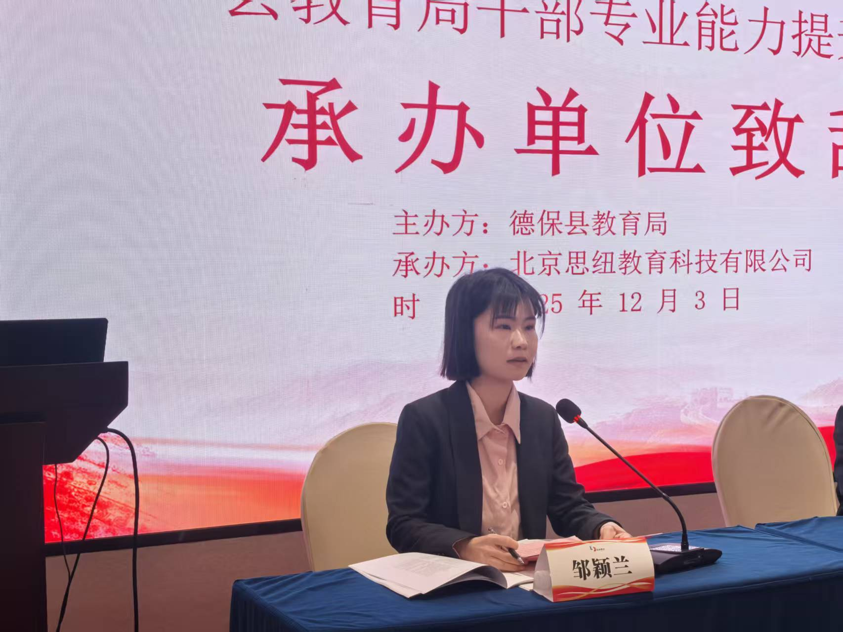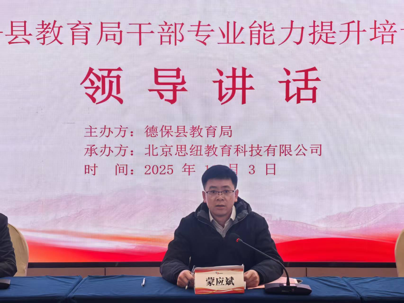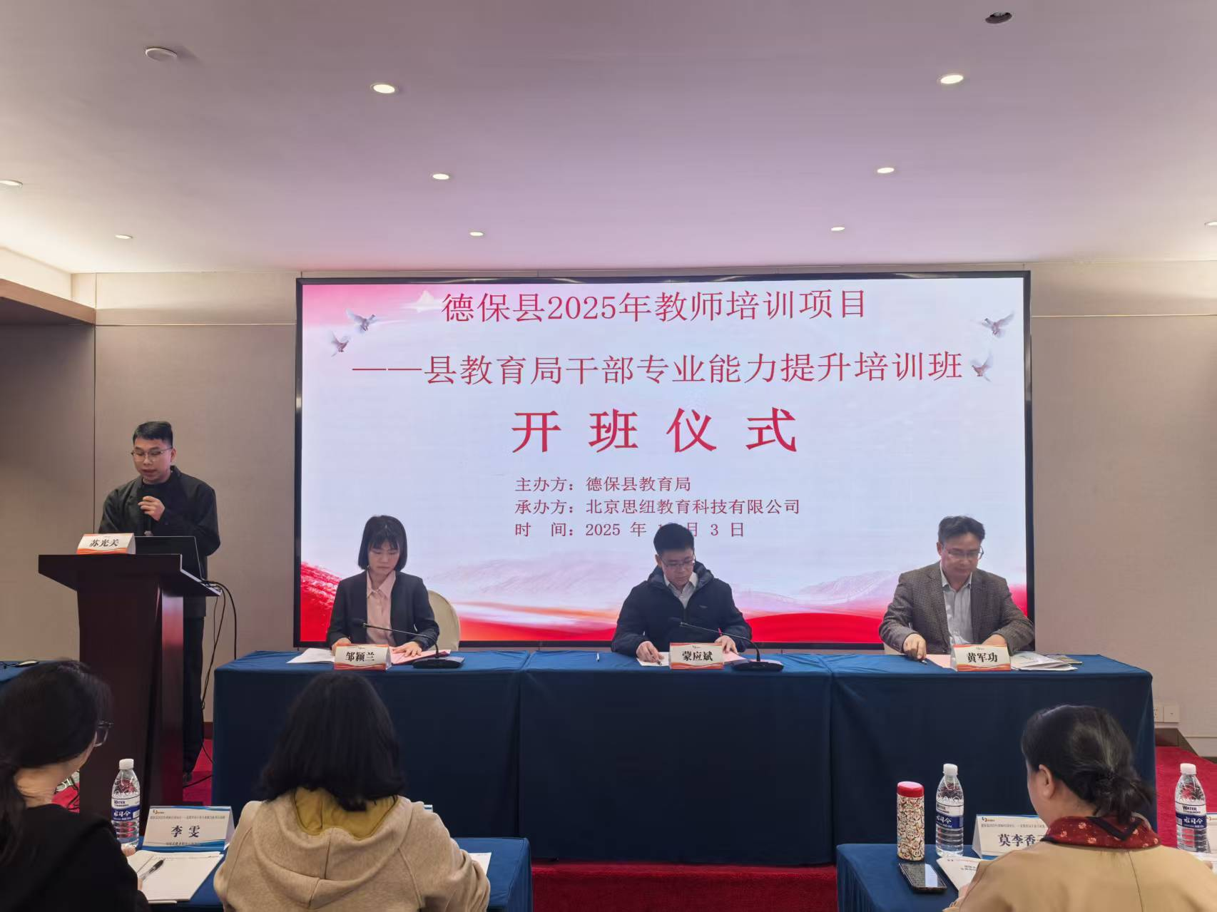 为深入贯彻《教育强国建设规划纲要(2024—2035年)》要求,落实义务教育优质均衡发展与教育数字化转型战略部署,切实提升县域教育治理“主力军”专业能力,由德保县教育局主办、北京思纽教育科技有限公司承办的“德保县2025年教师培训项目—县教育局干部专业能力提升培训班”,于2025年12月3日上午正式开班。德保县教育局党组成员蒙应斌、教研室副主任黄军功,北京思纽教育科技有限公司广西办事处副主任邹颖兰出席开班仪式,县教育局各股室干部及相关负责人共30名学员参训。